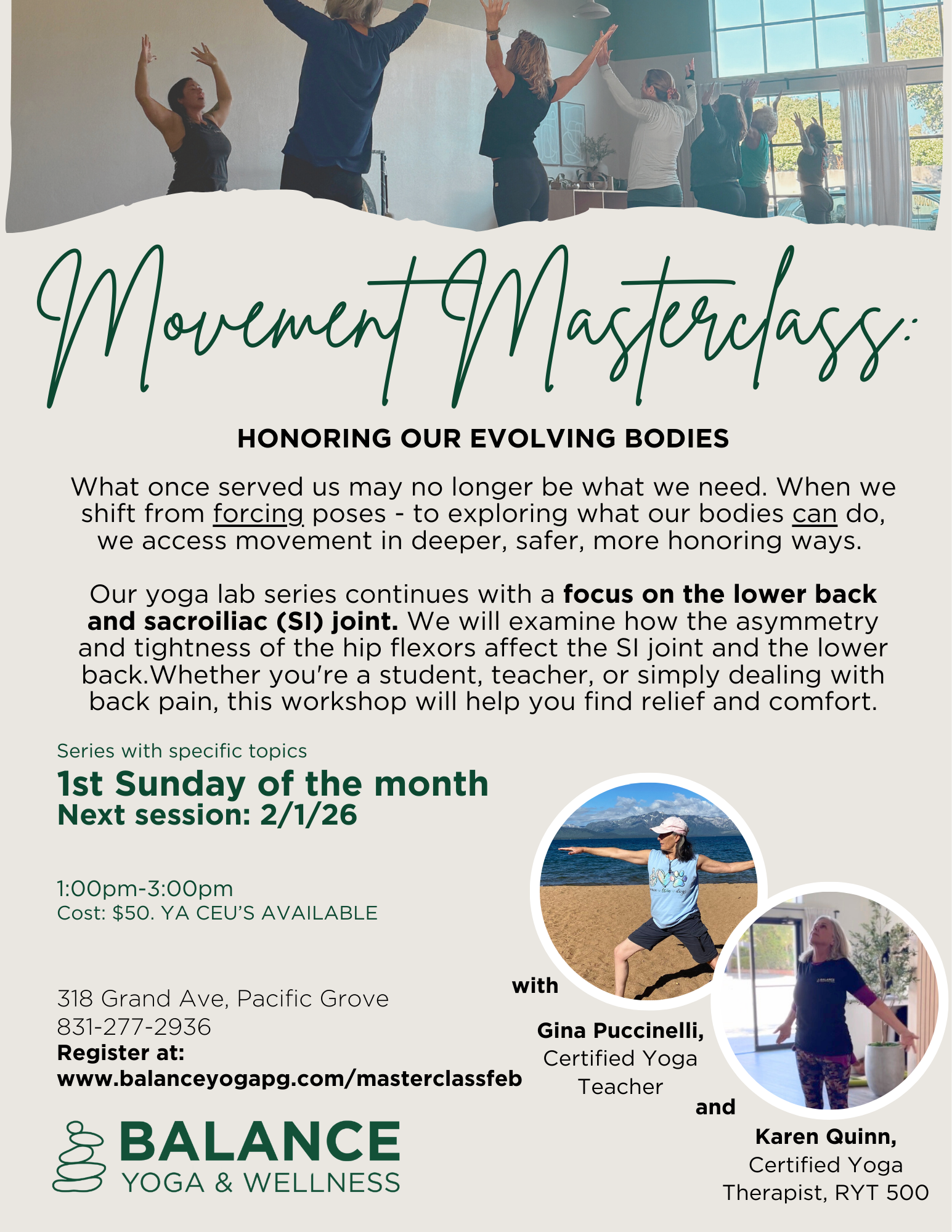 Upcoming Events Movement Masterclass with Karen & Gina Sunday, February 1st | 1:00 - 3:00pm Movement Masterclass Feb 1, 2026 $50.00 Add to cart